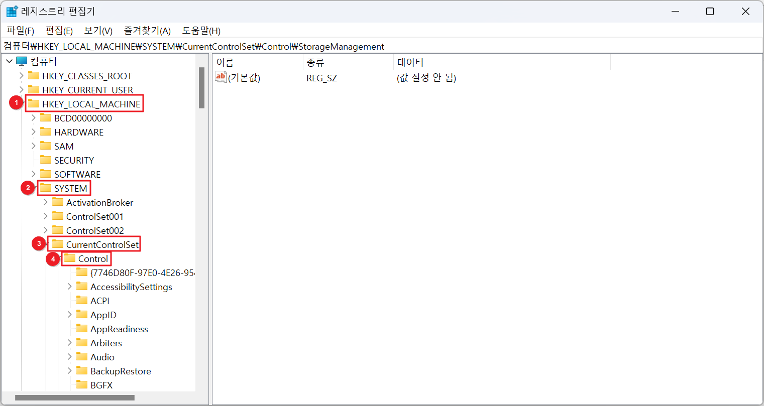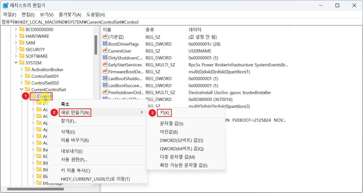 레지스트리 편집기에 접근했다면 [ HKEY_LOCAL_MACHINE - SYSTEM -CurrentControlSet - Control ] 경로로 이동한다.