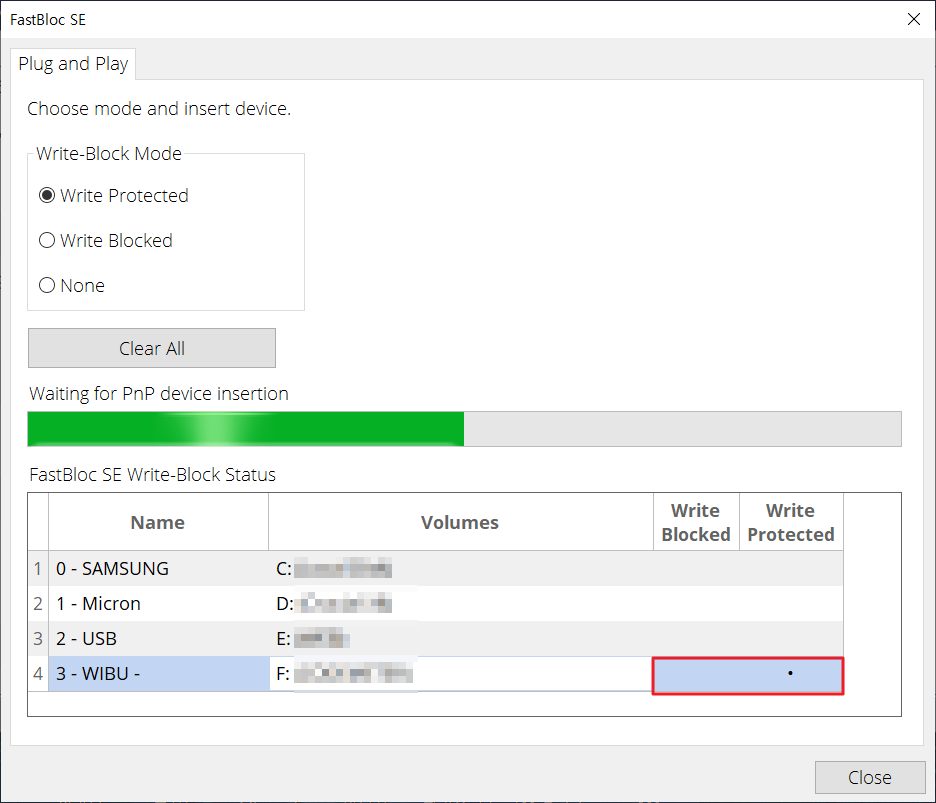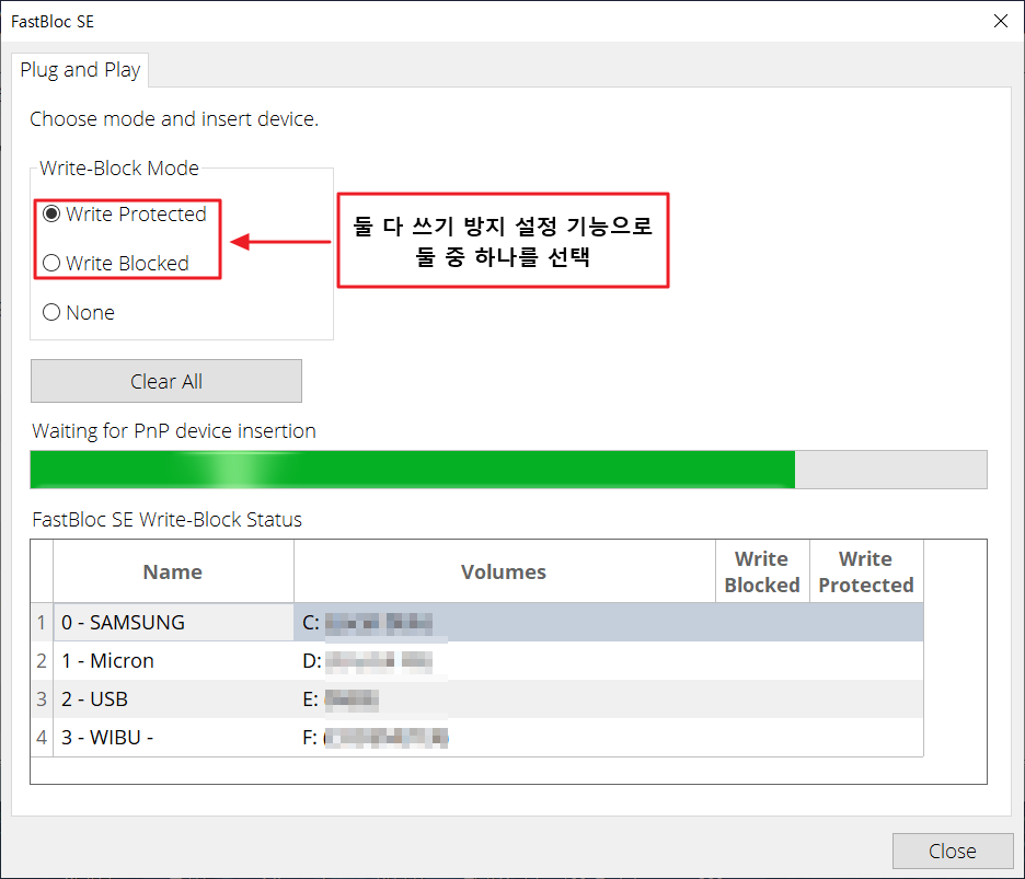[그림 9]와 같이 Write-Block Mode 둘 중 하나를 선택해 쓰기 방지를 설정 할 수 있는데 둘 의 차이점으로는 경고 메세지를 띄우는 방식과 언제 쓰기 방지를 적용할지의 차이가 있지만 결국 둘 다 쓰기 방지 설정 기능으로 하나를 선택해 사용하면 된다.