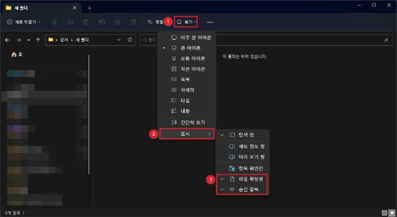 1. 파일 확장몇 및 숨긴 항목 보기 활성화