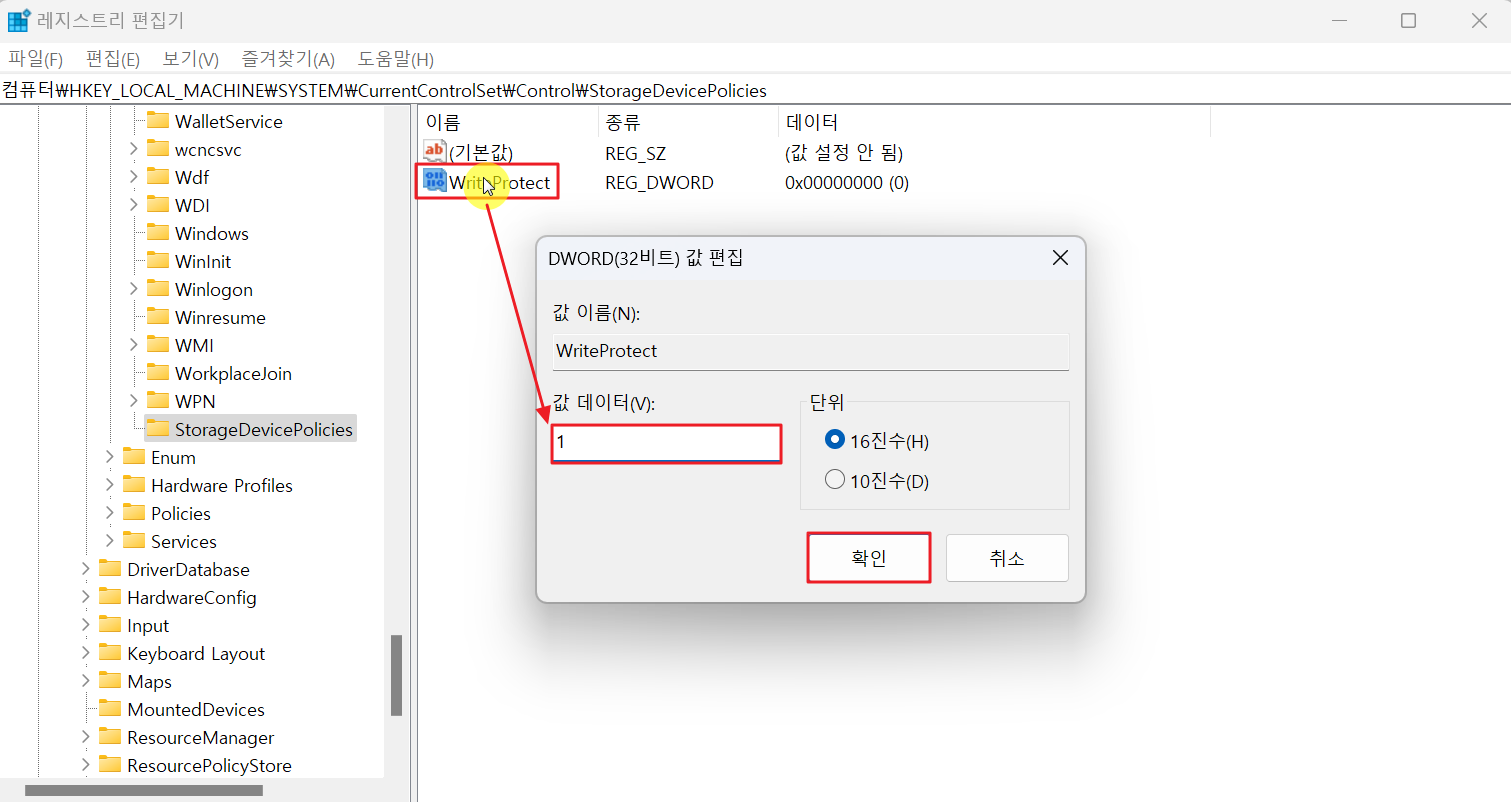 WriteProtect 레지스트를 클릭하여 값을 1로 변경해주면 이후 연결되는 USB 부터 쓰기 방지 정책이 적용되어 파일 쓰기가 되지 않는다.