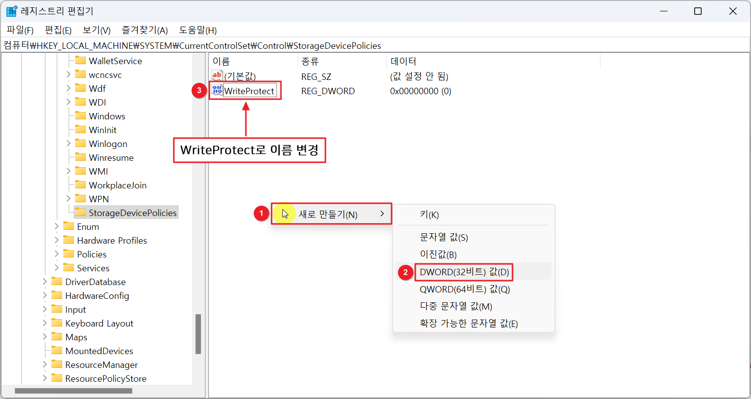 새로 생성한 디렉터리인 StorageDevicePolicies의 빈 공간에서 마우스 오른 쪽 버튼을 클릭하여새로운 DWORD(32비트) 레지스트리를 생성해준다. 그 후 생성된 레지스트리 이름을 "WriteProtect"로 변경해준다.