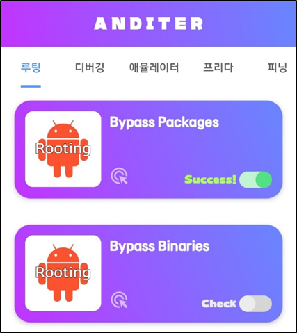 컴파일 과정이 끝났다면 산출물인 apk 파일을 설치 후 ANDITER에서 Bypass Packages 항목을 체크하면 Success!가 출력되며 탐지가 우회된 것을 볼 수 있다.