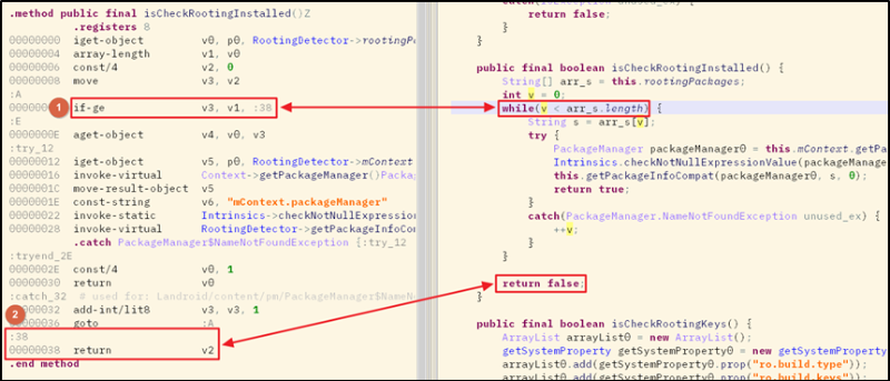 smali 코드 위치가 확인이 되었다면 smali 코드에서 변조 포인트를 찾아야 한다. JEB 도구로 돌아와 [그림 6]의 매핑된 코드를 살펴보면 ① smali 코드 구문이 Java 소스코드의 while문 조건 구문이며 v4, v2 레지스터리에 저장된 값을 비교해 v4 값이 v2 보다 클 경우 38로 분기된다. 반대로 v4 값이 v2 보다 작을 경우 0x00000014 ~ 0x0000004C 주소까지 구문들이 동작해 패키지 검사를 하게 된다. ② 분기문 38의 smali 코드를 살펴보면 함수를 호출한 곳으로 false 값이 반환된다. 따라서, 첫 번째 smali 코드 구문의 조건문을 참으로 만들어 분기문 38로 분기시킨 다음 false 값을 반환할 수 있도록 변조하면 된다.