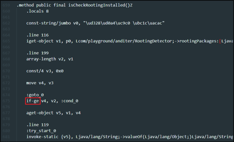 Bypass Packages 탐지를 우회하기 위한 포인트는 두 가지가 있다. 첫 번째는 [그림 1]의 검사하는 패키지 목록을 가지고 있는 rootingPackages 리스트 요소를 더미 값으로 변조하는 방법이고 두 번째는 isCheckRootingInstalled() 함수에서 사용되는 While문의 조건식을 변조해 While 구문이 동작되지 않도록 만드는 방법이다. 여기서는 리패키징 방식으로 두 번째 방법을 사용해 탐지를 우회해 보도록 하겠다.