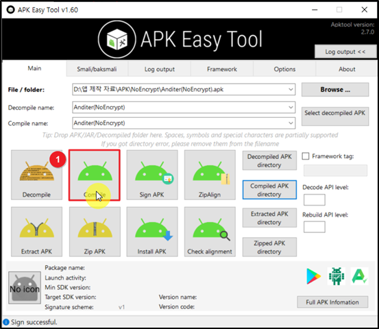 samli 코드 수정이 완료되었다면 실행 파일인 apk 파일로 다시 만들어줘야 한다. smali 코드를 apk 파일로 만들기 위해서는 smali 코드를 컴파일해 Dex 파일로 변환하고 사이닝 및 리빌딩 과정을 거쳐야 한다. 이러한 일련의 과정들은 손도 많이 가고 각각의 과정에서 그에 맞는 도구들을 사용해야 하지만, APK Easy Tool를 사용하면 원 클릭으로 smali 코드를 다시 apk 파일로 리패키징 할 수 있다. 디컴파일 했던 apk 디렉터리를 다른 곳으로 이동시키지 않았다면 [그림 8]와 같이 Compile 버튼을 클릭하면 자동으로 컴파일 되어 apk 파일로 만들어진다.