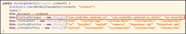Bypass Packages 항목은 디바이스에 설치된 앱 패키지 목록을 검사해 루팅 시 사용되는 알려진 패키지 목록들이 존재하는지 검사하고 패키지 존재 시 루팅 디바이스로 판단해 탐지하게 된다.