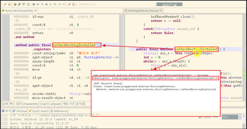 [그림 5]는 isCheckRootingInstalled() 함수명을 smali 코드랑 매핑한 결과이다. 추가로 코드에 마우스를 가져다 대고 잠시 기다리면 매개변수, 반환 값 등 코드에 대한 간략한 설명이 나오는데 그 중 Decscriptor에는 smali 코드 경로가 표시되어 있다. 해당 기능을 사용하지 않고도 패키지 명과 함수 명을 통해서 smali 코드를 찾을 수 있으나, 난독화 모듈이 적용된 코드에서는 함수명이 a,b,c 알파벳 또는 숫자 등의 의미 없는 문자열로 지정되어 있어 찾는데 시간이 오래 소요되기 때문에 위 기능을 활용할 경우 분석 시간을 단축 시킬 수 있다.