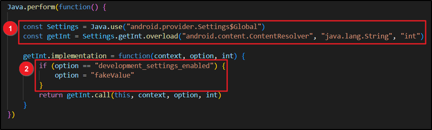 [그림 5]는 getInt() 함수를 후킹하기 위해 필자가 작성한 Frida 스크립트이다. 코드를 보면 ①에서 getInt() 함수 사용을 위해 Settings 클래스 객체를 생성했고 isCheckDevelopMode()에서 getInt() 함수를 호출할 때 전달되는 인자의 데이터 타입에 맞춰 getInt() 함수를 오버로딩으로 구현한다. ②에서는 함수 호출 시 매개 변수 들어오는 설정 값이 development_settings_enabled일 경우 더미 값으로 변조하고 변조한 더미 값을 인저로 원본 getInt() 함수를 호출해 해당 결과 값을 반환하게 된다.