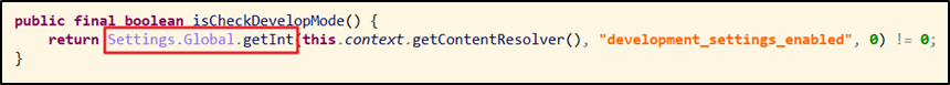 [그림 3-28]의 isCheckDevelopMode() 함수는 Bypass Develop Mode 탐지 결과를 반환해주는 역할을 한다. 코드를 보면 Settings 클래스가 사용 되었는데 해당 클래스는 디바이스에서 사용하는 설정에 관련된 정보들을 제공해 주며 내부 클래스인 Global를 통해 디바이스에 공통적으로 적용되는 설정 값을 참조할 수 있다. 그리고 인자로 전달되는 development_settings_enabled 설정 값을 getInt() 함수를 통해 반환 받게 된다. 값이 0이면 개발자 옵션이 비활성화 상태를 뜻하고 1이면 활성화 상태를 뜻한다. 따라서, 값이 1인 경우 디버그 모드가 동작 중인 것으로 판단해 탐지하게 된다.