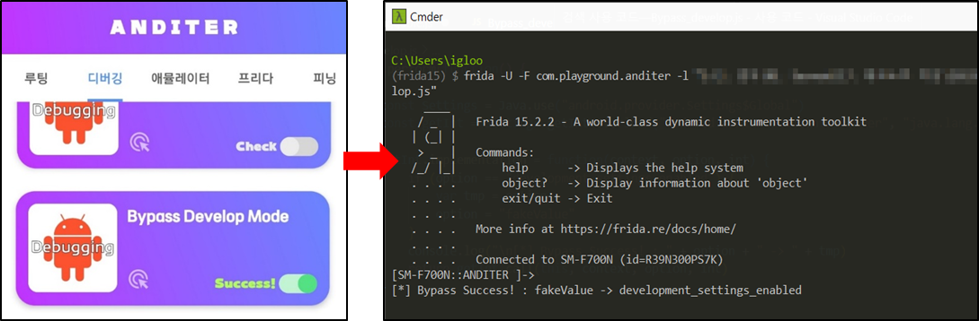 Frida를 통해 작성한 스크립트를 ADITER 애플리케이션에 어태치 하고 Bypass Develop Mode 탐지 항목을 체크하면 Success! 가 출력되며 탐지가 우회된 것을 볼 수 있다.