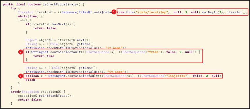 [그림 4]의 isCheckFridaBinary() 함수는 Bypass File & Path 탐지 결과를 반환해주는 역할을 한다. 코드를 보면 ①에서 File 클래스를 사용해 /data/local/tmp 디렉터리 객체를 생성하고 maxDepath() 함수를 통해 깊이 2만큼의 하위 디렉터리 및 파일 정보를 가지고 온다. ②, ③에서는 ①에서 가지고 온 디렉터리 및 파일 이름에 Frida와 linjector 라는 문자열이 포함되어 있는지 검사하고 파일 존재 시 Frida 사용자로 탐지하게 된다.