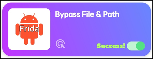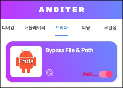 Frida를 통해 작성한 스크립트를 ADITER 애플리케이션에 어태치 한다. 그 후 Bypass File & Path 탐지 항목을 체크하면 Success! 가 출력되며 탐지가 우회된 것을 볼 수 있다.
