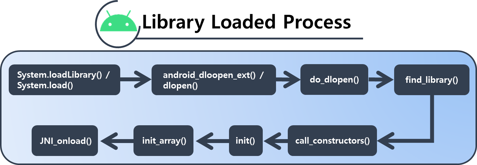 이 세 가지 함수는 주로 라이브러리 파일을 로드하는 데 사용되며, android_dlopen_ext()의 경우 런타임에 공유 라이브러리를 동적으로 로드할 때 사용된다. dlopen() 함수를 사용하여 동적 라이브러리를 로드할 수 있지만, 안드로이드 플랫폼에서는 android_dlopen_ext() 함수를 사용하여 몇 가지 더 추가적인 기능을 수행할 수 있게 된다. 참고로 디바이스가 API 28 이상(Android 9.0)인 경우 android_dlopen_ext() 함수를 사용하고 그 미만인 경우 dlopen()을 사용한다. |