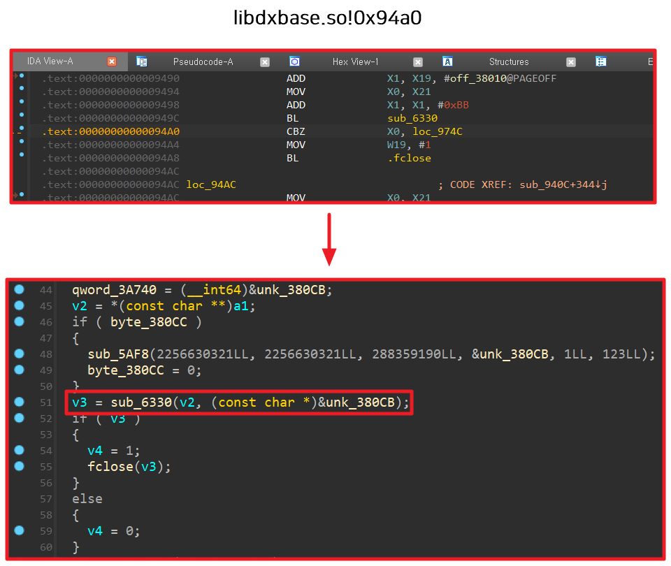 "libdxbase.so" 라이브러리 파일을 디컴파일 후 [그림 3]에서 확인한 "0x6348" 주소를 살펴보면 "sub_6330()" 함수 내부에서 fopen() 함수가 호출된 것을 볼 수 있다. 참고로 Unix 계열의 운영체제에서 fopen() 함수를 통해 파일 열람 시 내부적으로 open() 함수를 호출하여 파일 디스크립터(File Descriptor) 값을 가져오기 때문에 [그림 4]의 로직에서는 open() 함수가 쓰이지 않았지만 [그림 3]에서는 open() 함수가 호출된 것으로 나온다.