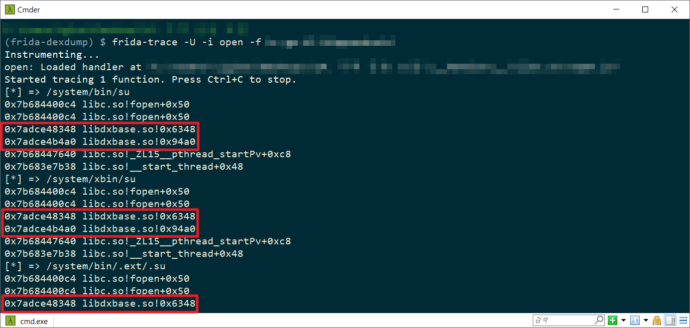 frida-trace -U -i open -f [앱 이름]트레이싱 결과 [그림 1]과 같이 네이티브 코드를 통해 /system/bin/su, /sbin/su, /data/local/tmp/re.frida.server 등 루팅 및 Frida 탐지 시 사용되는 파일들이 열람되고 있으며, 이를 통해 루팅과 Frida를 탐지하고 있다고 추정할 수 있다.
