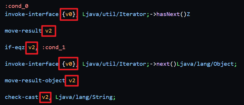 [그림 3]의 "v"로 시작하는 변수는 가상 레지스터 변수를 의미하며, 뒤에 숫자는 첫 번째, 두 번째, 세 번째 변수를 뜻한다. 또한, 해당 가상 레지스터는 smali 코드에서 데이터를 저장하고 조작 시 사용되며, 실제로는 메모리 상에 위치하지 않고 프로그램의 실행 중에만 임시로 사용되는 변수로 주로 연산, 비교, 조건 분기 구문 등에서 활용된다.