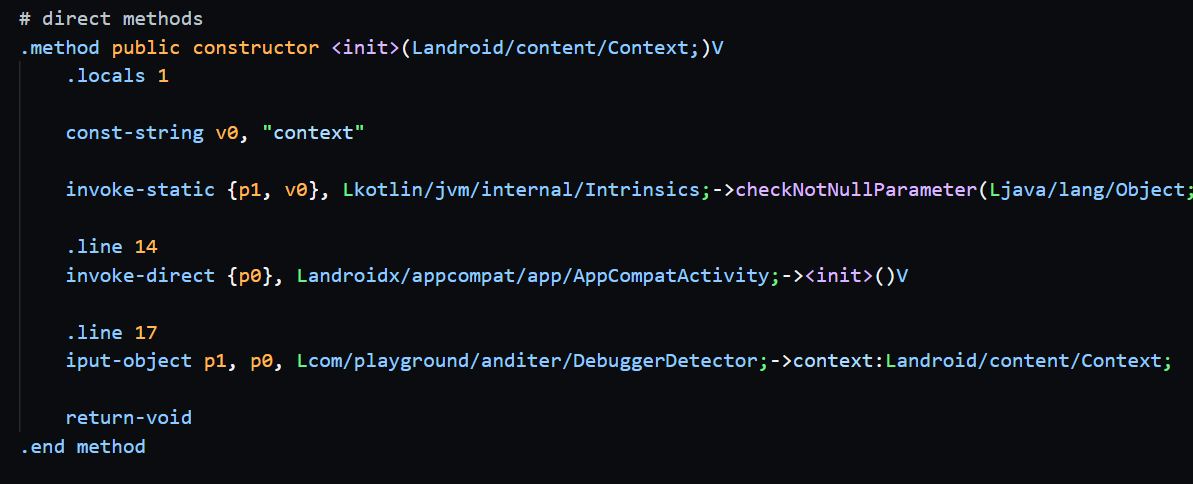 아래 코드는 특정 앱의 smali 코드이며, 구문을 해석한 것이다.