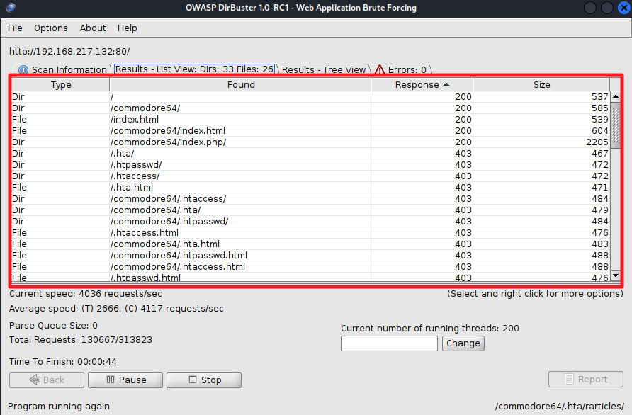 // 사전 파일은 common.txt를 사용하며, "html" 확장자를 가진 파일을 탐색해 그 결과를 dirb_output.txt 파일로 저장한다.