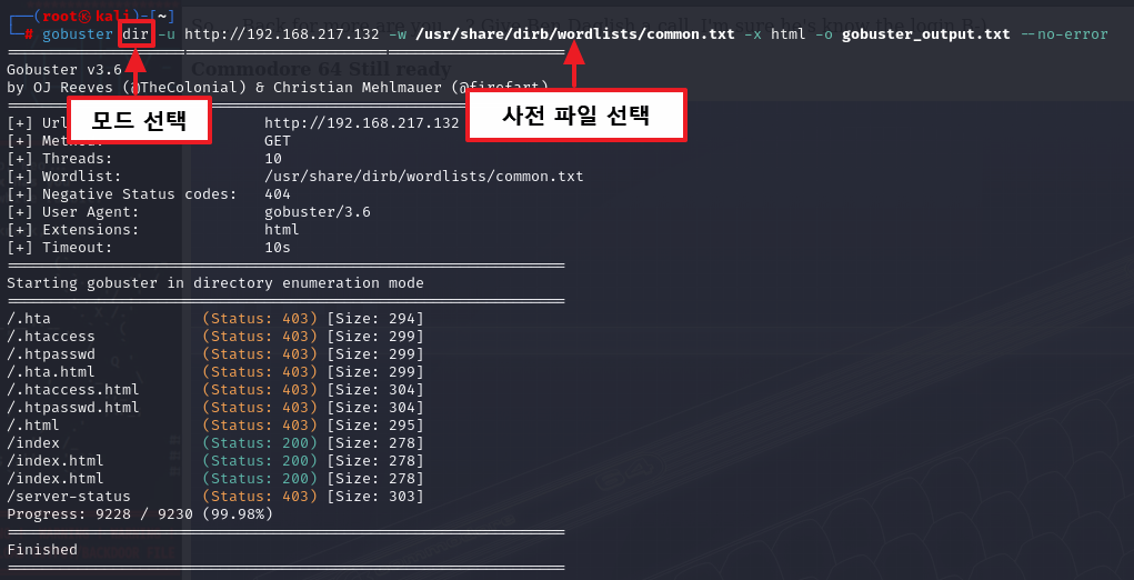 gobuster dir -u [URL 주소] -w /usr/share/dirb/wordlists/common.txt -x html -o gobuster_output.txt --no-error