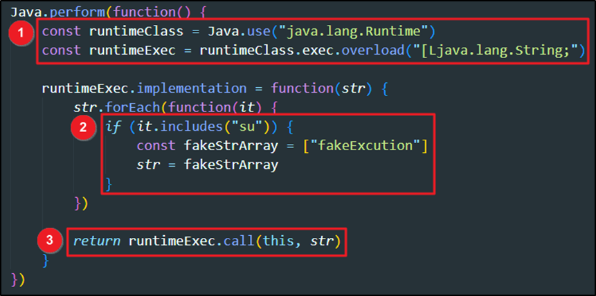 [그림 3]은 Runtime클래스의 exec() 함수를 후킹하기 위해 필자가 작성한 Frida 스크립트이다. 코드를 보면 ① exec() 함수 사용을 위해 Runtime 클래스 객체를 반환받고 isCheckRootingExec()에서 exec() 함수 호출 시 전달되는 인수의 데이터 타입에 맞춰 exec() 함수를 오버로딩으로 구현했다. ②에서는 함수로 들어오는 매개 변수 중 su 문자열이 포함되어 있을 경우 더미 값으로 변조하고 ③ 변조한 더미 값을 인수로 원본 exec() 함수를 호출해 결과 값을 반환하게 된다.
