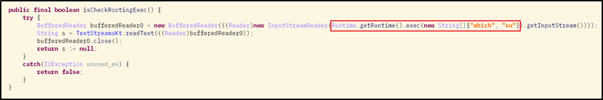 [그림 2]의 isCheckRootingExec() 함수는 Bypass Command Execution 탐지 결과를 반환해 주는 역할을 한다. 코드를 살펴보면 Runtime.getRuntime().exec() 함수가 사용된 것을 볼 수 있는데 Runtime.exec()는 Windows, Linux, Unix 등의 시스템 명령어를 Java를 통해 실행한 후 그 결과를 받아오는 기능을 가지고 있다. 위 코드에서는 which와 su 를 인수 값으로 실행 결과를 받아와 su 명령어가 해당 디바이스에 존재하는지 검사한다.