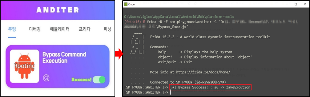 Frida를 통해 작성한 스크립트를 ADITER 애플케이션에 어태치 한다. 그 후 Bypass Command Execution 탐지 항목을 체크하면 Success! 가 출력되며 탐지가 우회된 것을 볼 수 있다.