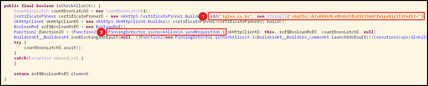 [그림 3]의 isCheckAllowCA() 함수는 Bypass Pinning(Allow CA) 탐지 결과를 반환해주는 역할을 한다. 코드를 보면 ①에서 OkHttp.certificatePinner 클래스 객체를 생성할 때 호스트 이름과 서버의 인증서 해시 값을 인자로 넘겨주고 있으며 해당 해시 값이 서버와 통신 시 인증서 비교에 사용되는 값이다. 따라서, 서버가 반환하는 인증서의 해시 값을 "sha256/+hIxKEB6NLsH9zGi9fx81iY3nbFfuipoNjz1liPufEI=“와 비교해 다를 경우 통신을 하지 못하게 한다. ② ①에서 생성한 객체를 코루틴 인자로 넘겨줘서 서버와 실질적인 통신 작업을 수행한다.