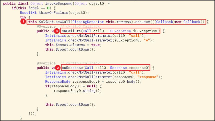 [그림 4]는 "안드로이드 피닝(Pinning) 개요 및Root CA 검증 우회 방법" 의 [그림 15]에서 살펴본 함수와 동일한 기능을 수행하는 코루틴의 suspend() 함수이다. ① [그림 4]의 isCheckAllowCA() 함수에서 생성한 OkHttp.certificatePinner 클래스 객체를 통해 통신을 수행하게 되며 ② 통신 성공 시 onResponse() 함수가 동작되며 ③ 통신 실패 시 onFailure() 함수가 실행된다.