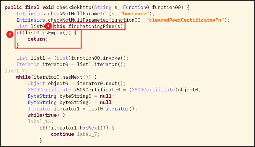 [그림 5]의 check$okhttp() 함수는 클라이언트와 서버가 SSL/TLS HandShake를 진행할 때 인증서의 유효성 검사 시 사용되는 함수이다. ① 함수 내에서 사용되는 findMatchingPins() 함수의 경우 호스트 이름과 매핑되는 인증서의 핀 리스트를 반환하는 역할을 수행하는데 호스트 이름과 일치하는 고정된 인증서가 존재하지 않을 경우 빈 리스트를 반환하게 된다. ② ①에서 반환 받은 리스트가 빈 리스트라면 check$okhttp() 함수는 인증서에 대한 유효성 검사를 수행하지 않고 null 값을 반환하게 되며 이는 고정 인증서 핀을 우회하고 어떤 인증서든 사용할 수 있게 허용하게 된다.