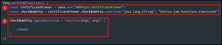 Bypass Pinning(Allow CA) 탐지를 우회하기 위한 후킹 포인트는 두 가지가 있다. 첫 번째는 인증서의 유효성 검사를 수행하지 않게 항상 null 값을 반환하도록 check$okhttp() 함수를 재 작성하는 방법이고 두 번째는 호스트 이름에 매핑되는 인증서를 찾을 때 사용하는 findMatchingPins() 함수의 결과 값을 매핑되는 인증서가 없을 때와 동일하게 항상 빈 리스트를 반환하도록 변조하는 방법이다. 여기서는 첫 번째 방법을 사용해 우회해 보도록 하겠다.