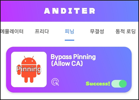 Frida를 통해 작성한 스크립트를 ADITER 애플리케이션에 어태치 한다. 그 후 프록시가 연결된 상태에서 Bypass Module 탐지 항목을 체크하면 Success! 가 출력되며 탐지가 우회된 것을 볼 수 있다.