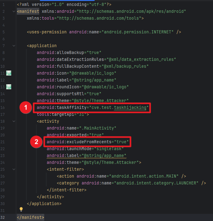 Android Studio에서 Attacker App 프로젝트를 열고, AndroidManifest.xml 파일을 확인한다.