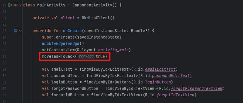 다음으로 "java/cve/test/attacker/MainActivity.kt" 클래스의 onCreate() 함수를 살펴보겠다. onCreate() 함수는 Activity가 생성될 때 호출되며, 앱의 초기화 및 설정 작업을 수행한다.