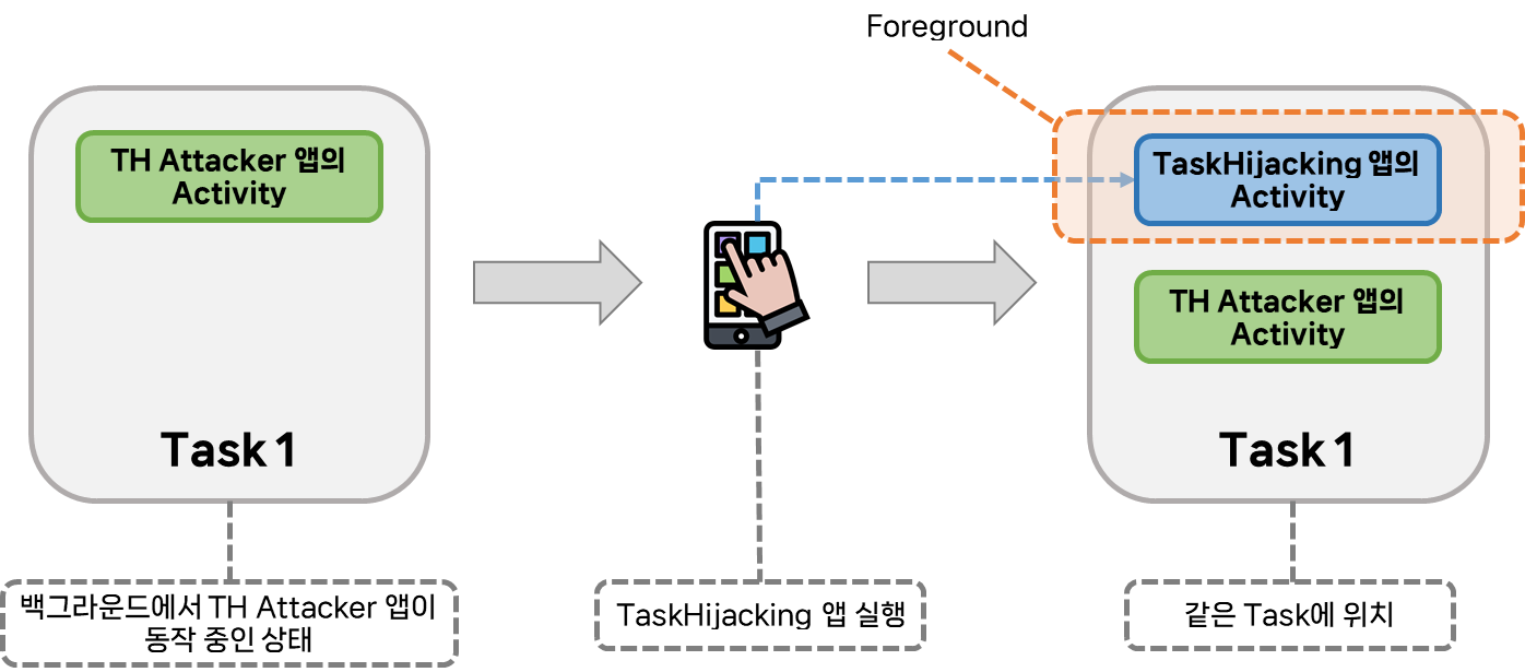 "singleTask" 모드로 지정된 경우 새 작업의 루트에서 활동(Activity)을 생성하거나, 동일한 어피니티(Affinity)를 가진 기존 작업(Task)에서 활동을 찾아 시작한다. 또한, 해당 활동이 백그라운드에 있을 경우, 전체 작업이 포그라운드로 전환된다. 이로 인해 공격자 앱이 취약한 앱과 동일한 어피니티 값을 설정할 수 있게 되면, 공격자 앱의 활동(Activity)과 취약한 앱의 활동이 동일한 작업(Task)에 함께 공존하게 되어 Task Hijacking이 가능해진다. 이는 공격자가 악의적인 의도로 해당 작업을 가로채어 사용자의 의도와 상관없이 다른 작업을 수행하도록 유도 할 수 있게 된다.