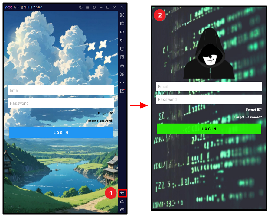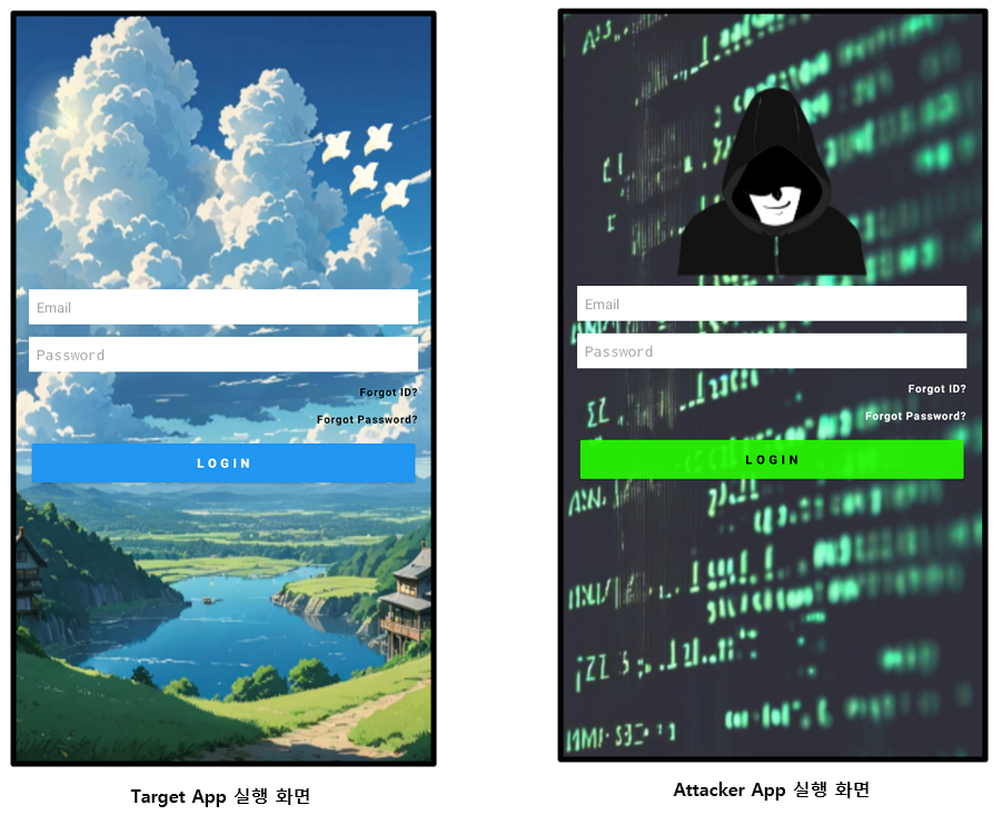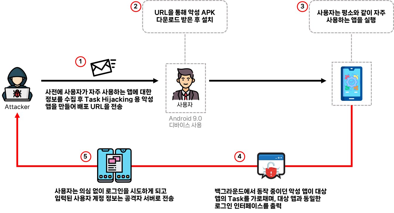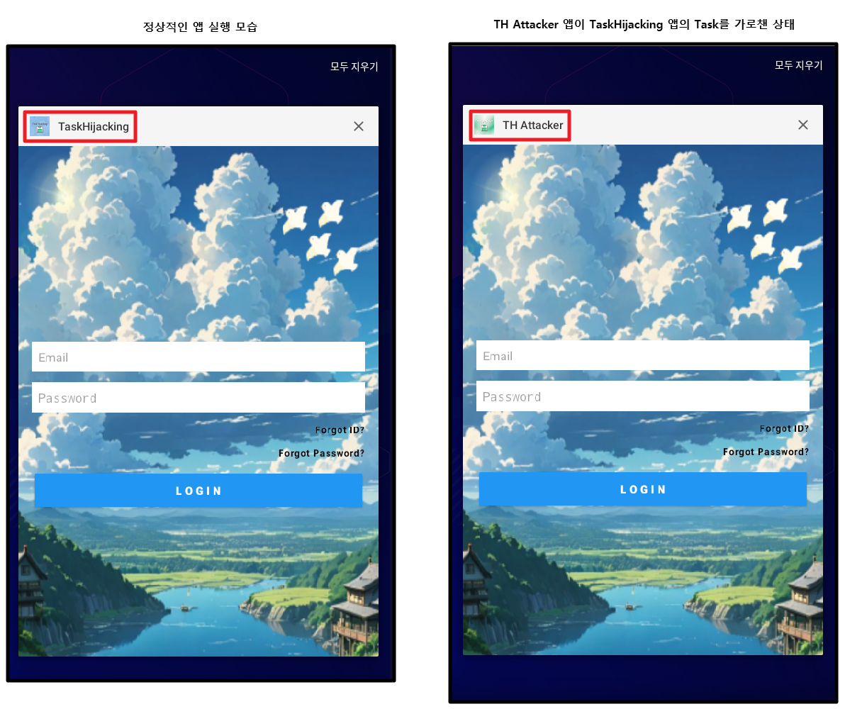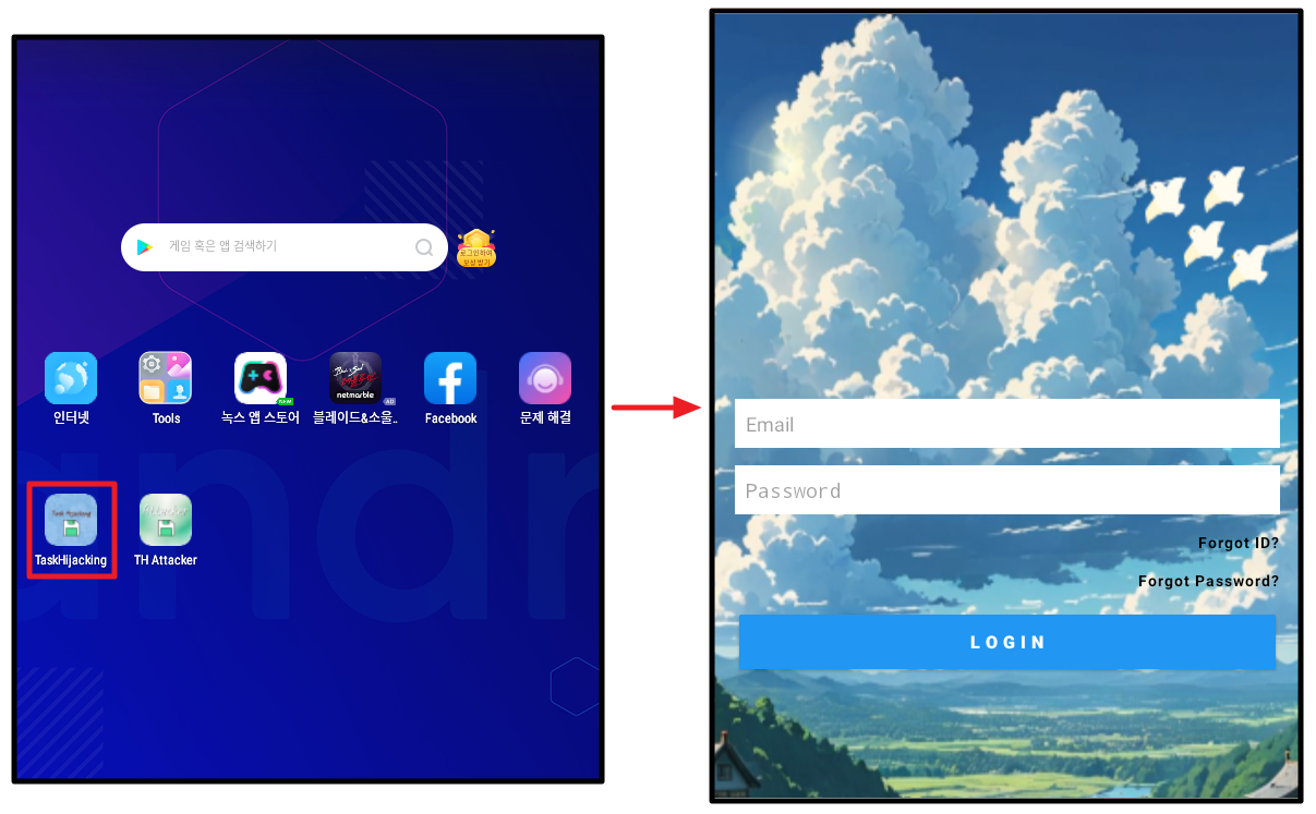 - 백그라드에서 동작 중이던 설치한 악성 앱이 실행된 앱의 Task를 가로채며, 해당 앱과 동일한 로그인 화면을 사용자에게 출력한다.