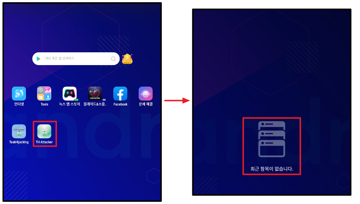 디바이스에서 최근 앱 실행 목록을 열어보면, [그림 17]의 오른쪽 화면처럼 앱의 이름이 TaskHijacking이 아닌 TH Attacker로 표시되는 것을 볼 수 있다. 이는 TaskHijacking(Target App) 앱이 TH Attacker(Attacker App) 앱 위에서 실행되고 있음을 의미한다.