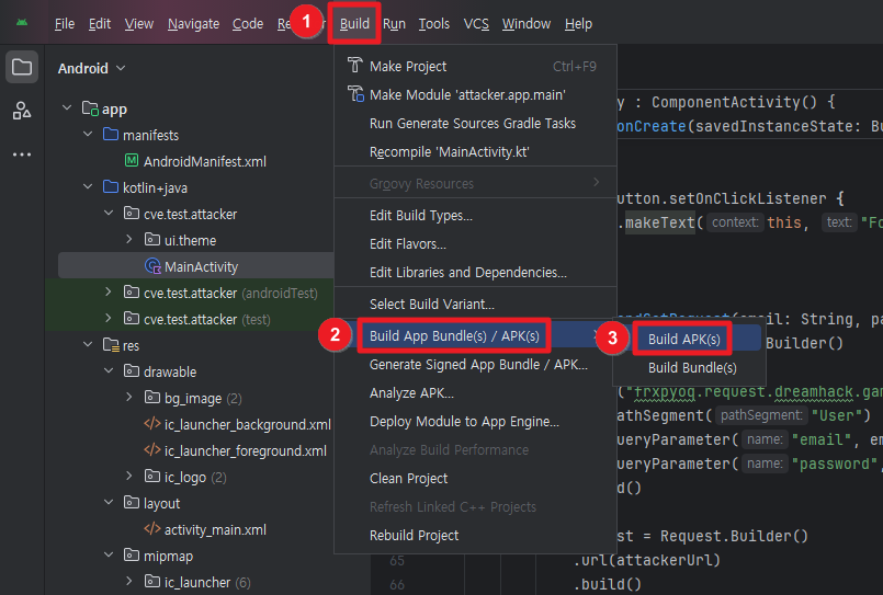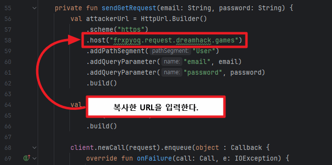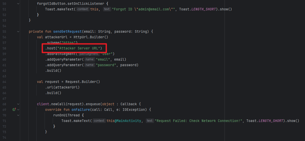 설치가 완료 되었다면, Android Studio를 통해 Attacker App 프로젝트를 불러온다. "java/cve/test/attacker/MainActivity.kt" 파일의 58번 라인에 Host 주소를 입력한다. 이렇게 설정하면, [그림 3]의 Attacker App에서 로그인을 시도 시 입력한 계정 정보(Email, Password)가 설정한 서버로 GET 메소드를 통해 값을 전송한다.