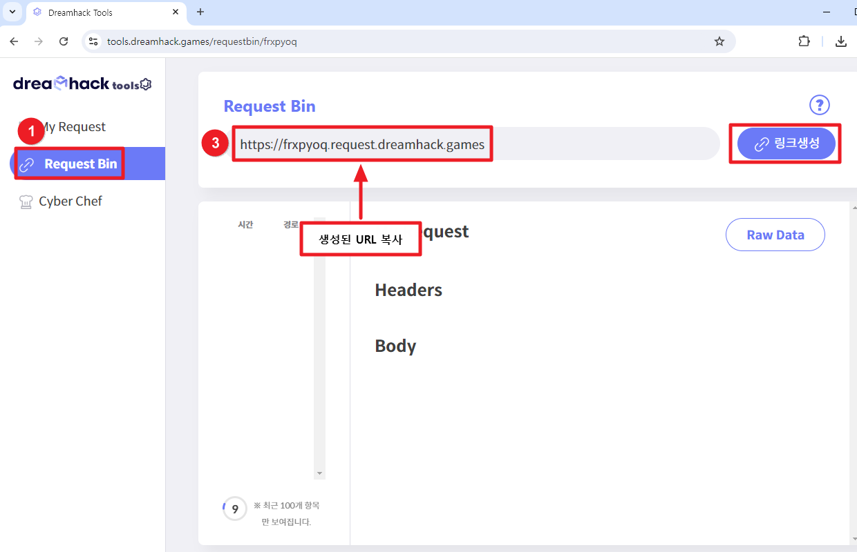첨부된 링크를 통해 Dream Hack Tools에 접속한 후, Request Bin 페이지에서 "링크 생성" 버튼을 클릭하여 생성된 URL을 복사한다.