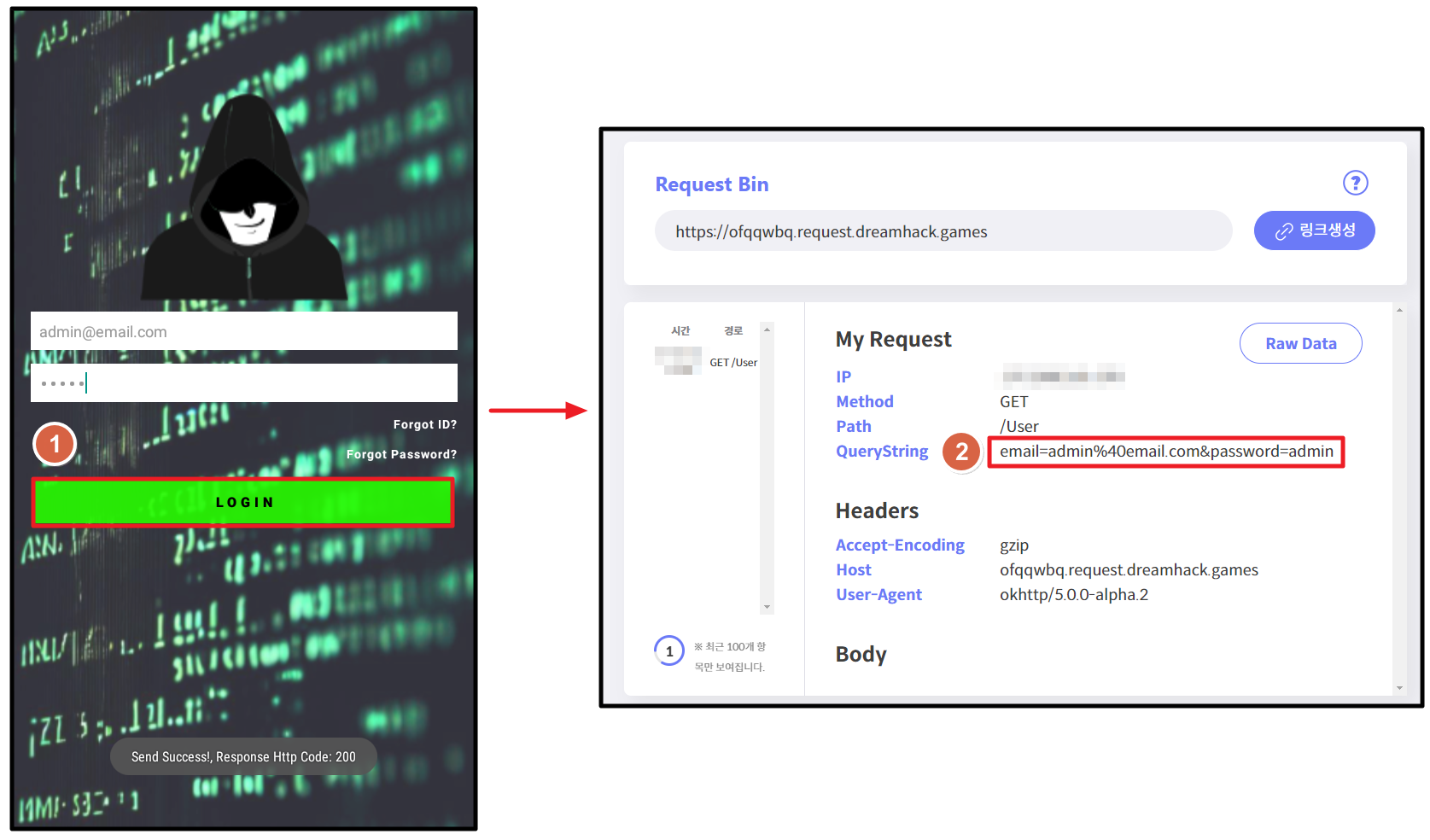- 사용자는 별 다른 의심 없이 평소와 같이 앱에 로그인을 시도하게 된다. 이때, 입력된 사용자 계정 정보는 공격자 서버로 전송되며, 정보 탈취가 이루어진다.