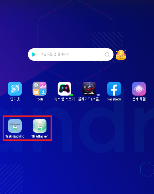 Target App과 Attacker App을 [그림 12]와 같이 Nox 앱 플레이어에 설치한다. "TaskHijacking" 이름을 가진 앱이 Target App이고, "TH Attacker" 이름을 가진 앱이 Attacker App이다.