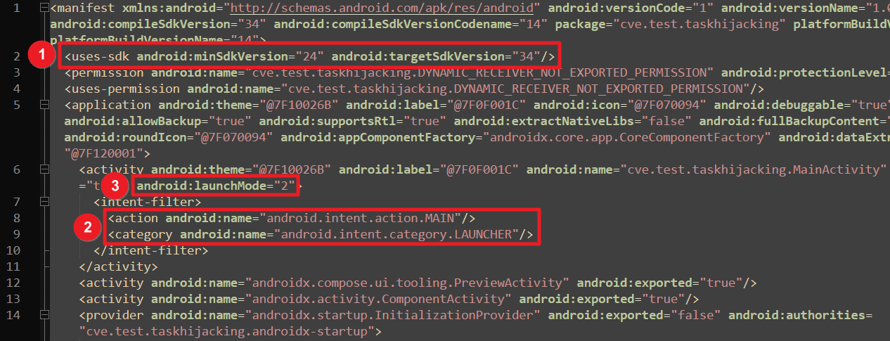 ② "cve.test.taskhijacking.MainActivity" 액티비티가 런처 모드로 설정되어 있음을 알 수 있다. 이는 사용자가 디바이스에서 앱 실행 아이콘을 클릭했을 때 가장 먼저 보여지는 활동(Activity)이라는 뜻이다.