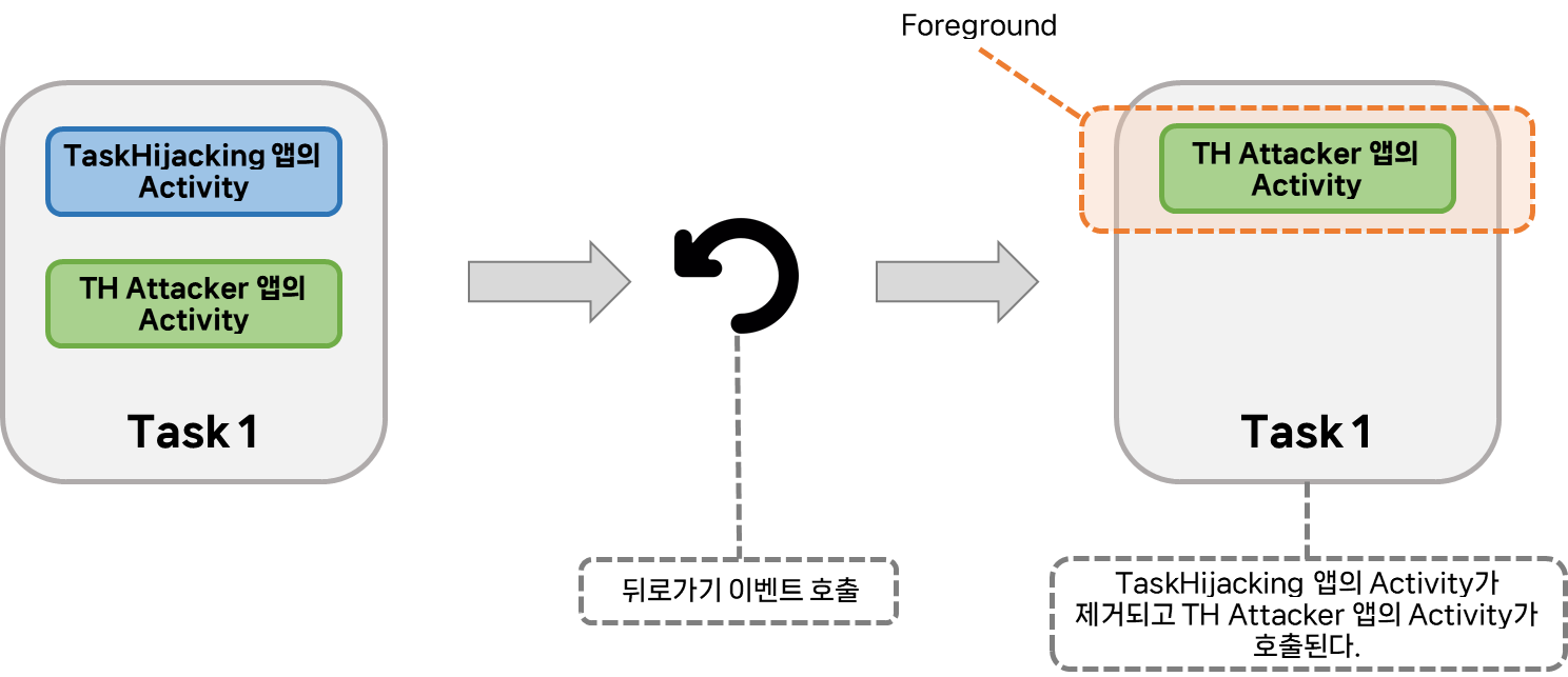 이를 통해 공격자는 사용자가 특정 앱을 사용하는 동안 악성 앱을 백그라운드에서 동작시켜 민감한 정보(권한 수집, 자격 증명 도용 등)를 수집할 수 있다.