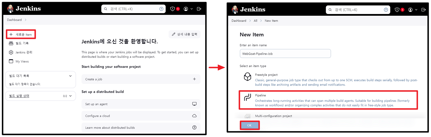 Jenkins 페이지에 접속한 후, 새로운 빌드 작업을 구성하기 위해 홈 화면에서 "새로운 Item" 버튼을 클릭한다. 작업 타입은 [그림 22]와 같이 "Pipeline"으로 지정해준다.