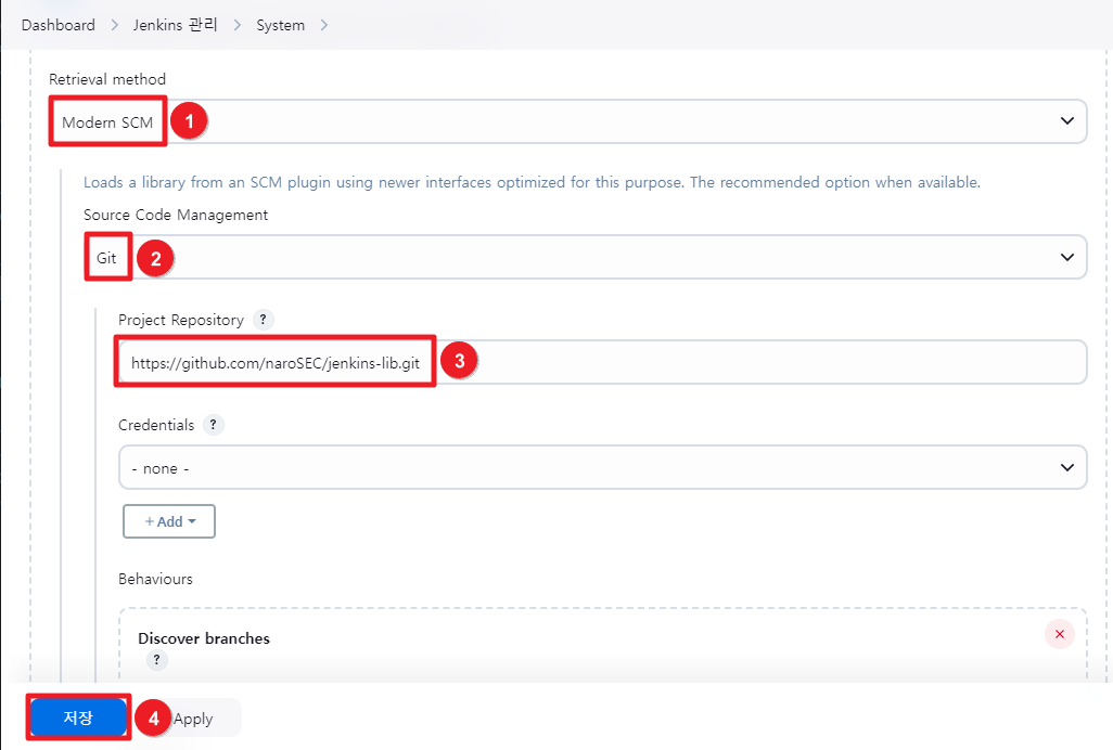 다음으로, ① "Retrieval method"에는 "Modern SCM"을 선택하고, ② SCM 플랫폼으로는 Git을 지정합니다. ③ "Project Repository" 필드에는 공유 라이브러리의 Repository URL을 입력한다.