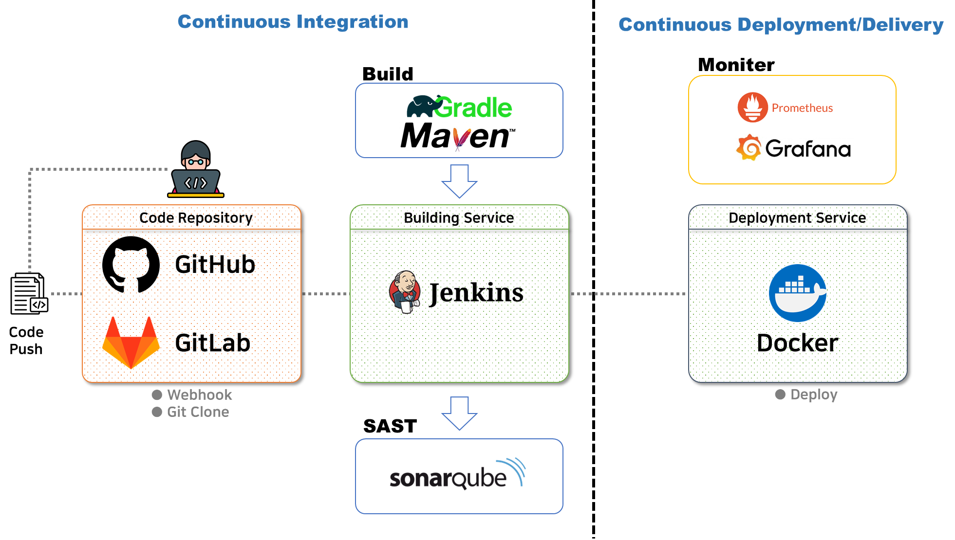 이번 포스팅에서는 DevOps의 핵심 개념 중 하나인 CI(Continuous Integration, 지속적인 통합)와 CD(Continuous Delivery /Continuous Deployment , 지속적인 제공/배포) 중, CI 파이프라인에서의 SAST(Static Application Security Testing) 적용 방안을 실습을 통해 알아보고자 한다.