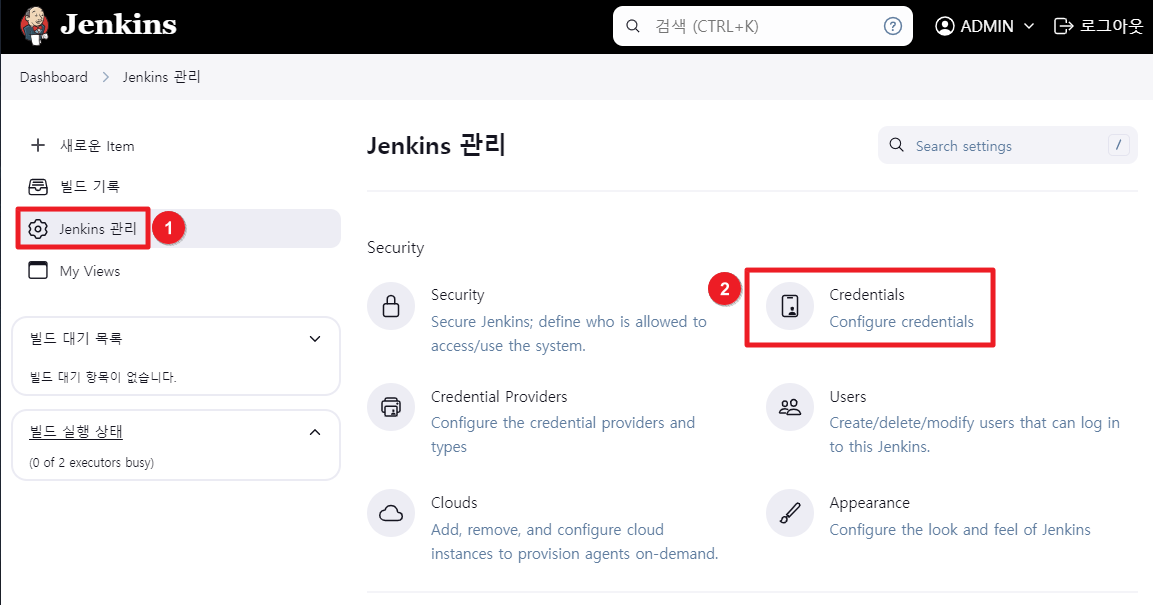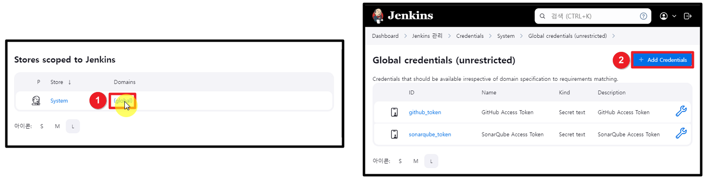 Jenkins에서 SonarQube로 프로젝트를 생성하고 소스코드를 분석하려면 SonarQube 서버에 접근할 수 있는 권한이 필요하다. 이를 위해 SonarQube Access Token을 등록해야 한다. "Jenkins 관리"에서 "Credentials" 항목으로 이동한다.
