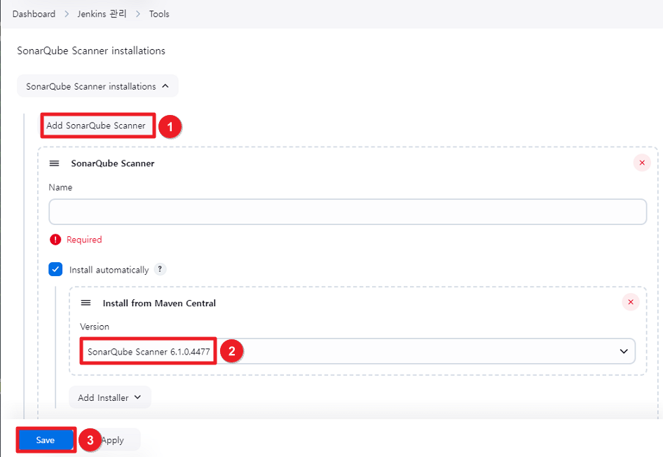 "SonarQube Scanner installations" 항목에서 "Add SonarQube Scanner" 버튼을 클릭하고 가장 최신 버전의 SonarQube Scanner를 선택한다.