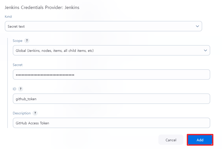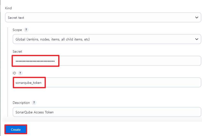 "Kind" 항목을 "Secret text"로 설정하고, "Secret" 입력란에 SonarQube Access Token 값을 입력해주면 된다.