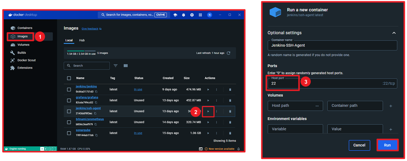 Docker Desktop에서 이전에 다운로드한 jenkins/ssh-agent 이미지를 사용하여 [그림 46]과 같이 컨테이너를 실행한다.