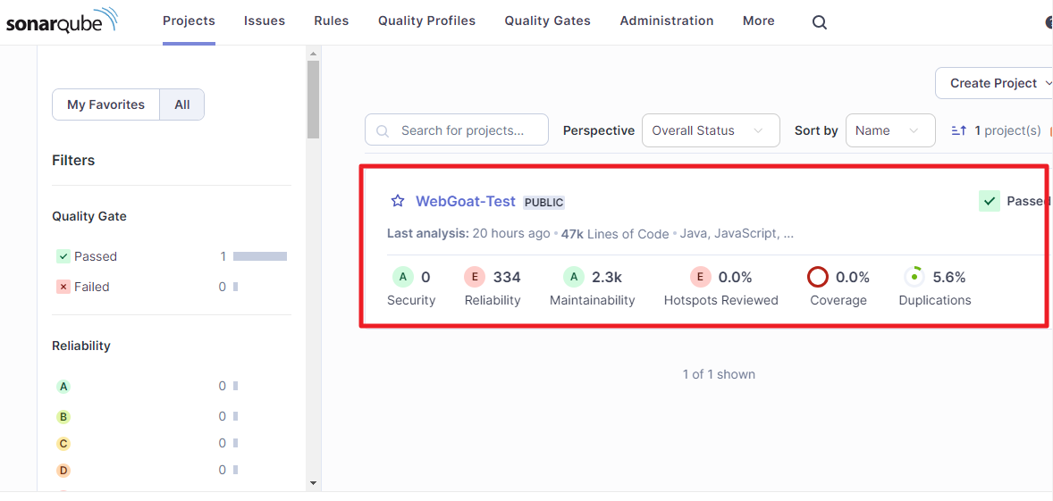 SonarQube 페이지를 확인해보면 SAST 산출물인 정적 코드 분석 결과도 확인할 수 있다.